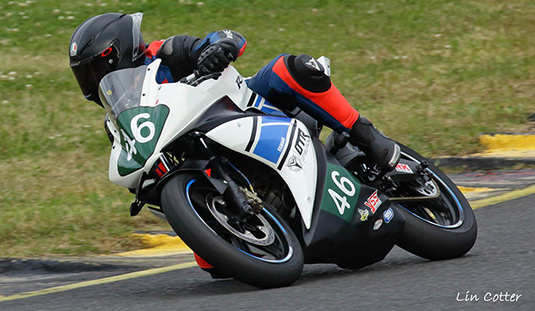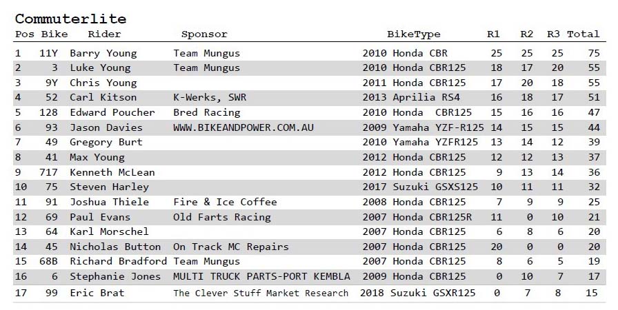 Commuterlite Championship Leader #128 Edward Poucher (Bred Racing Honda CBR125) finished 6th. followed by #93 Jason Davies #93 (Yamaha YFZR125) 7th.